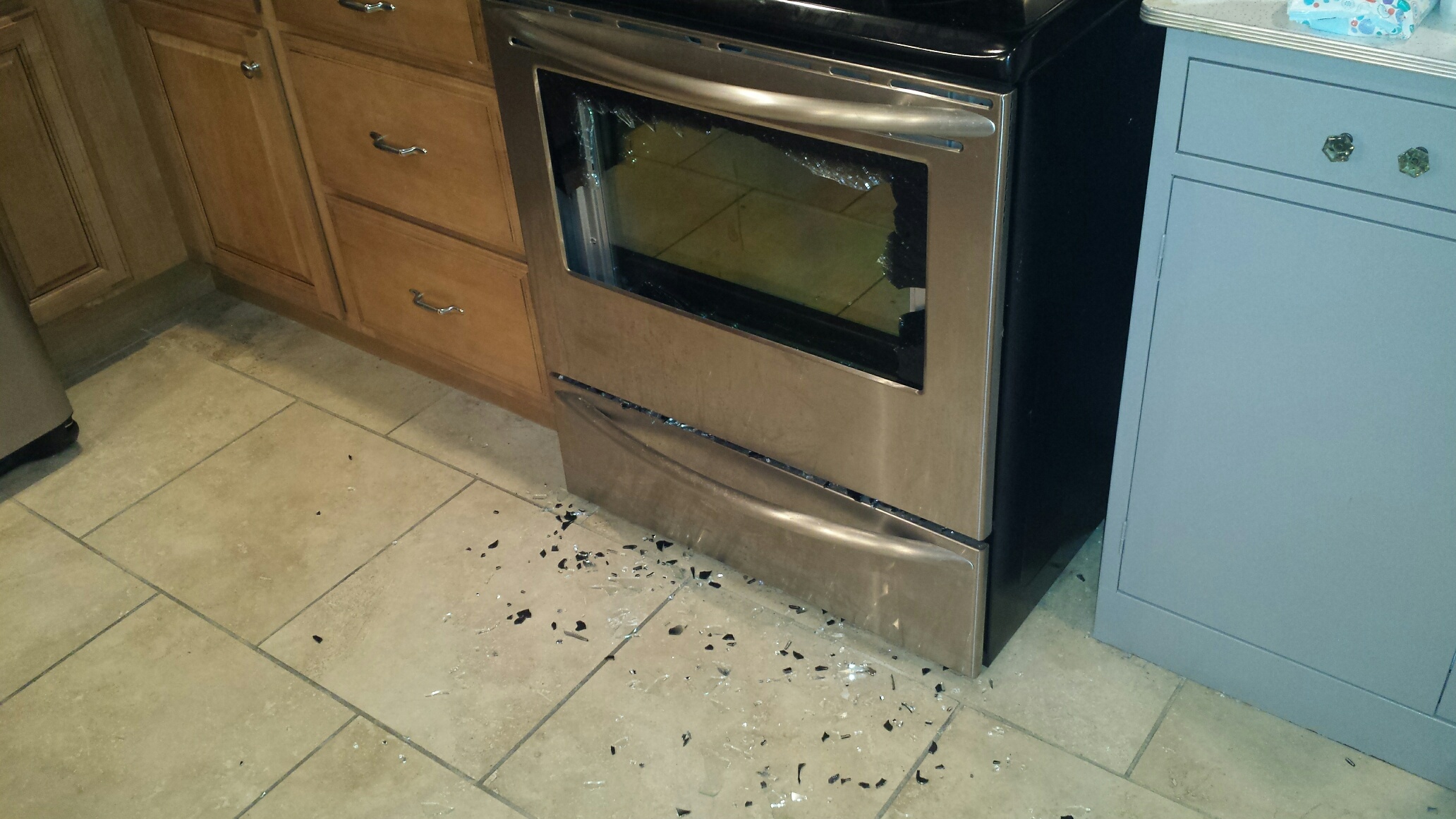 The consumer reports that the oven "exploded" breaking glass all over the kitchen floor. The consumer stated that the oven was not in use, nor was it hot.