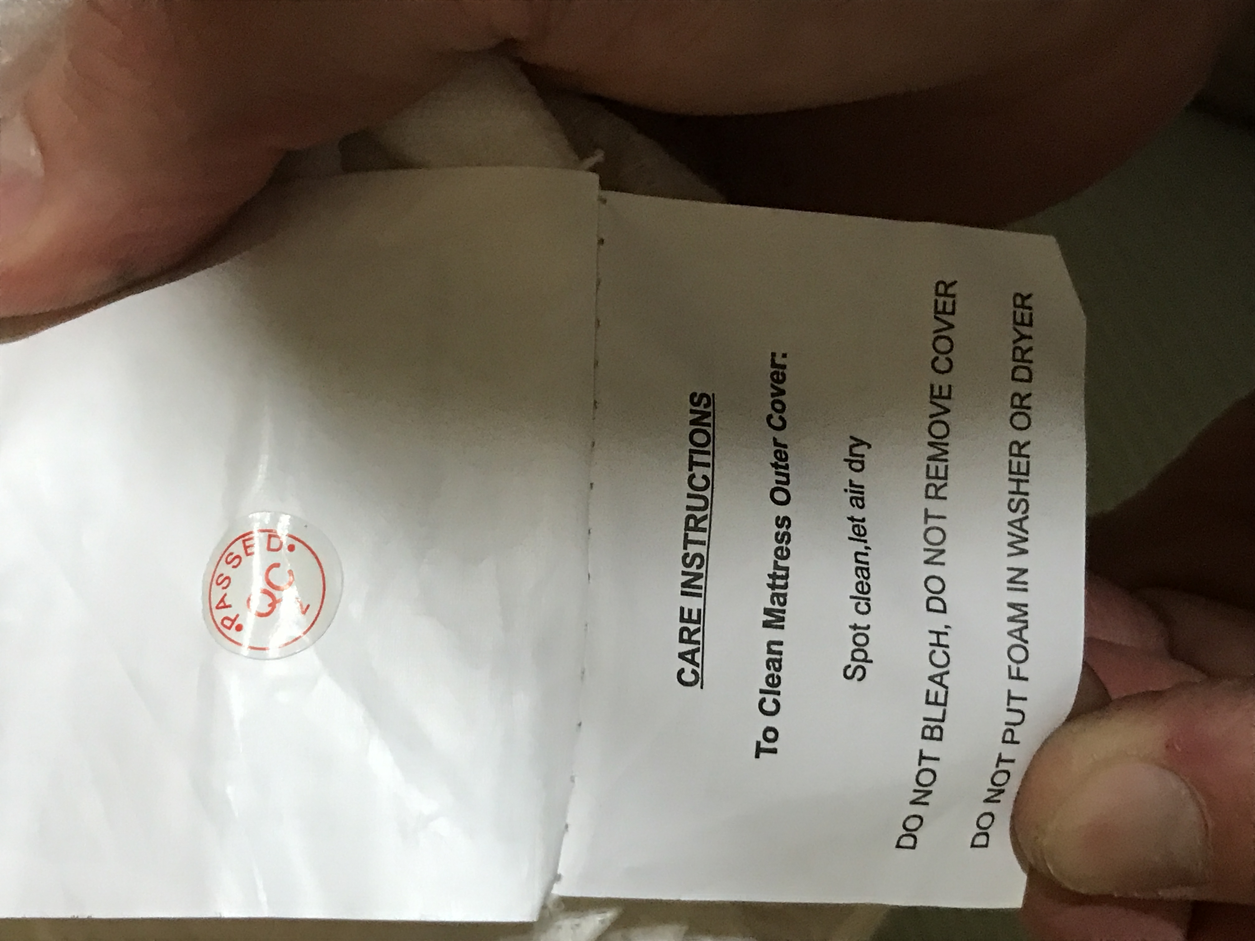 - Incident Description: On September 28, 2016, my fiancé and I purchased the Zinus Memory Foam 10 Inch Green Tea Mattress (via Amazon). A few nights ago, while changing our sheets and mattress protector, we noticed the large (easily accessible) zipper on the bottom of the mattress. Doubtful that the zipper was merely for aesthetic purposes, we decided to unzip and remove this cover to more easily reach the area we wanted to spot clean. The tag's Care Instructions refer to both an "outer cover" and a "cover," and also states, "do not put foam in washer or dryer" (not sure how one fits an entire mattress inside a washer or dryer). In light of the above ambiguities, I interpreted "do not remove cover" to mean "do not remove the fire retardant mesh cover" (as that would presumably make the mattress flammable). Therefore, my fiance and I proceeded to unzip and remove the knitted cover. ]