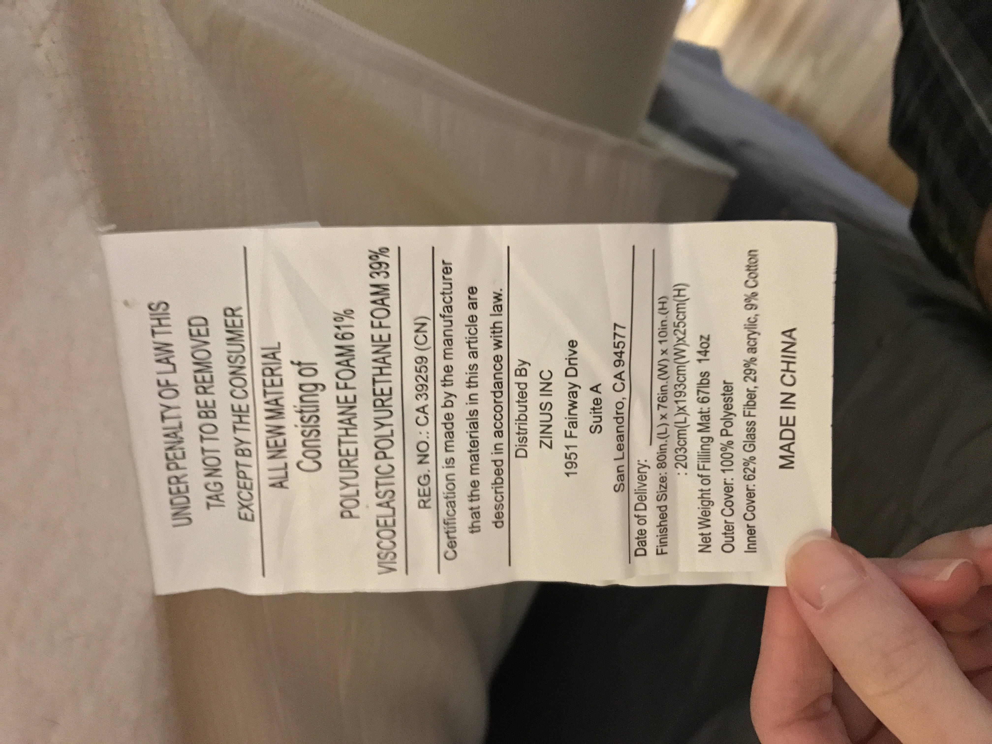 The incident report simply describes the consequences of the consumer’s misuse of the mattress. The fiberglass in the fire retardant barrier cannot cause itching or asthma-related symptoms if it is not disrupted by removal of the mattress cover. As the incident report admits, the care instructions on the mattress state: “To Clean Mattress Outer Cover . . . DO NOT REMOVE COVER”. To prevent the consumer from opening the zipper, the location of the slider body at the end of the closed zipper has been sewn over, as is apparent in the image of the mattress cover attached by the consumer. In addition, Zinus removed the zipper pull tab as an added deterrence to opening the zipper and removing the cover. Fiberglass will not be a safety issue if the care instructions are followed and the mattress cover is not removed, as warned against on the product labeling.