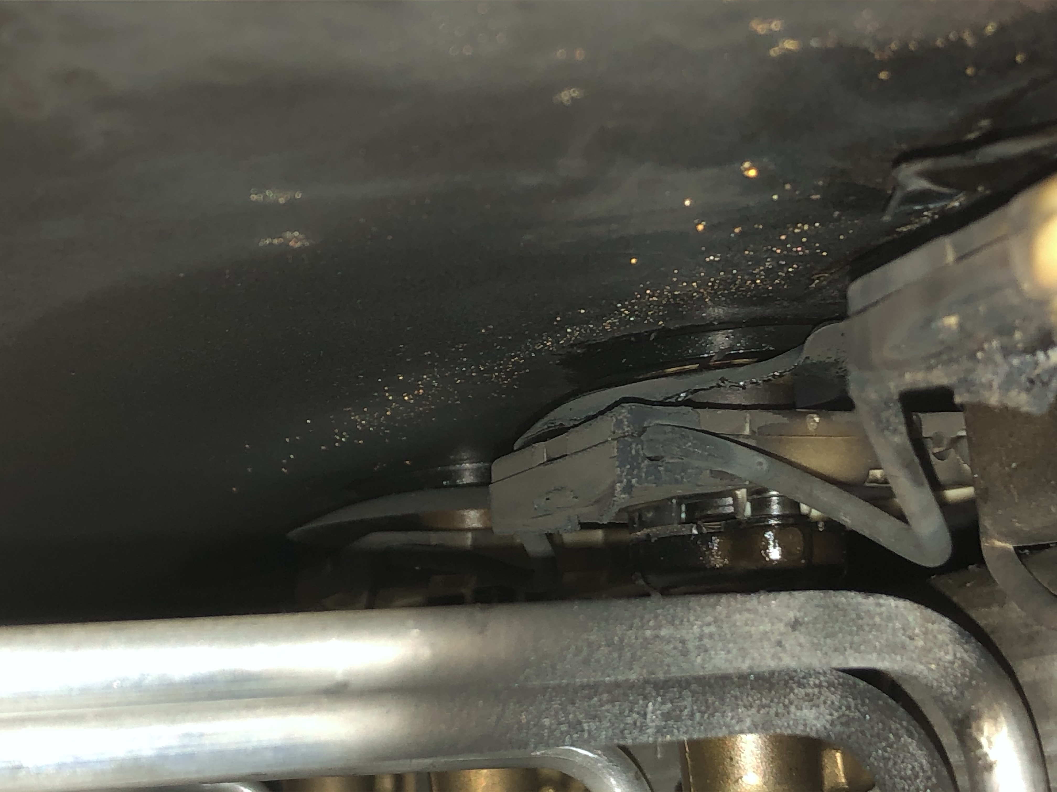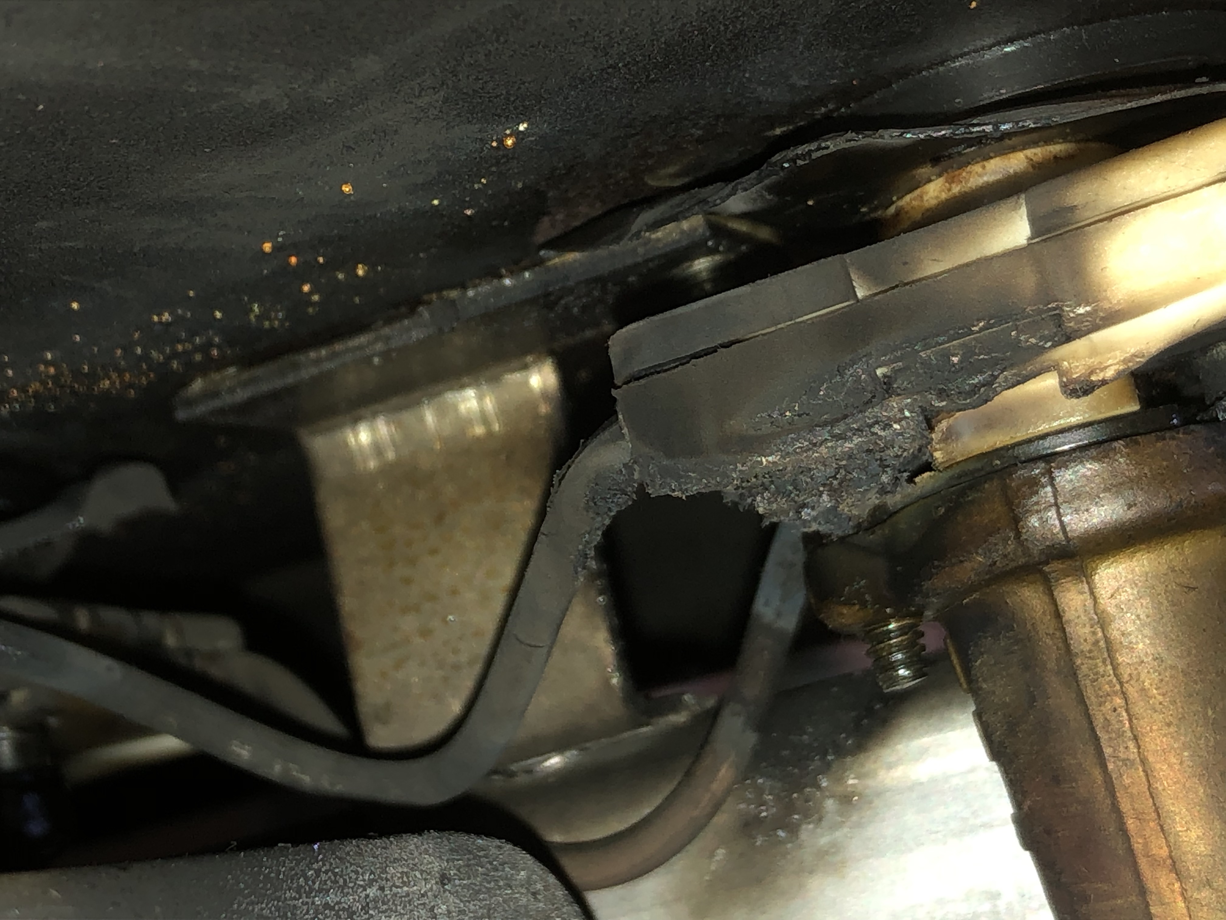 The images show the layout of the range and the specific controller that was burned. Charred wiring is visible as well as charring and soot in the surrounding area. The burner control is a combination of gas valve and electric components, presumably used to activate the igniter for that respective burner.