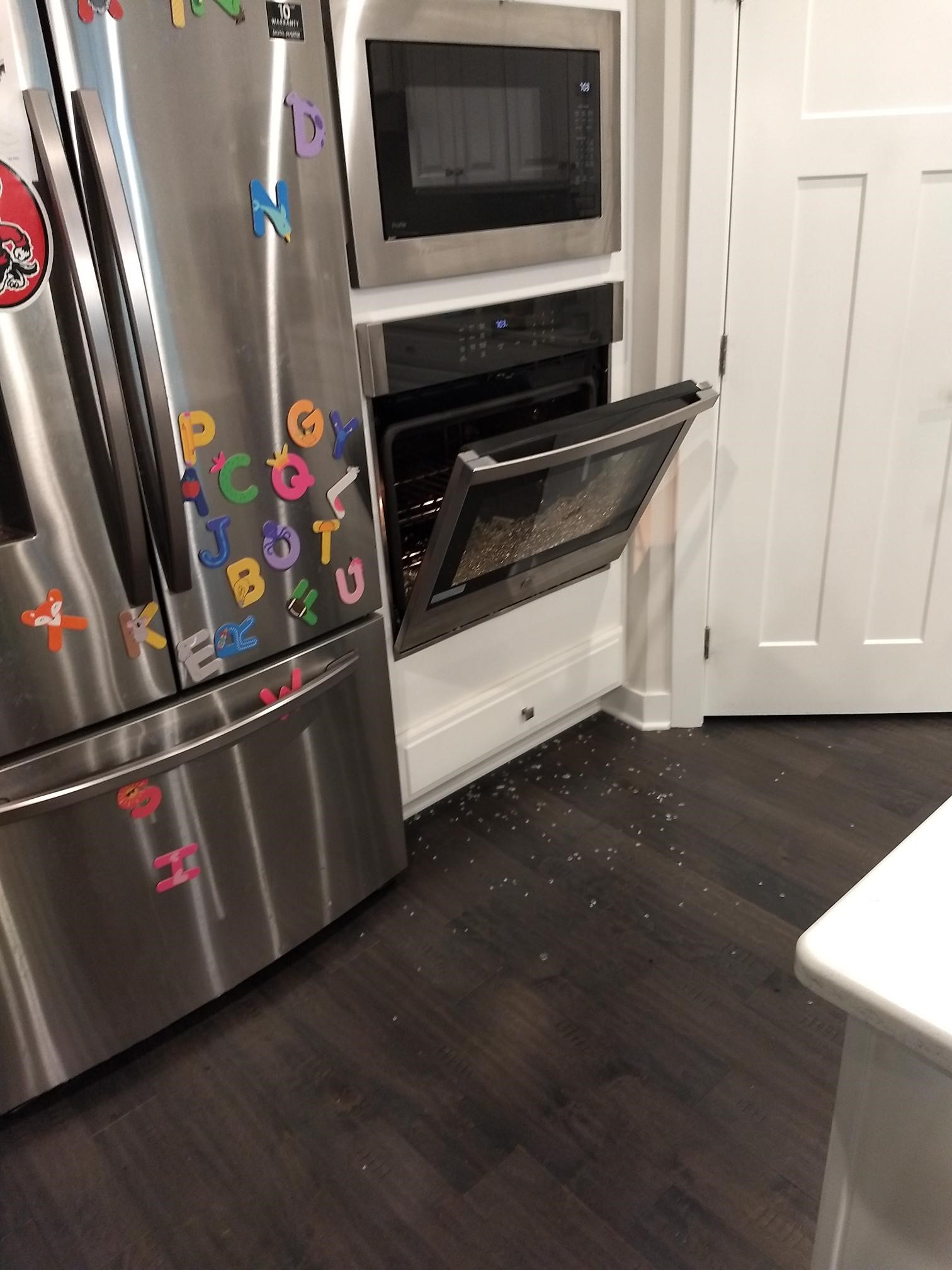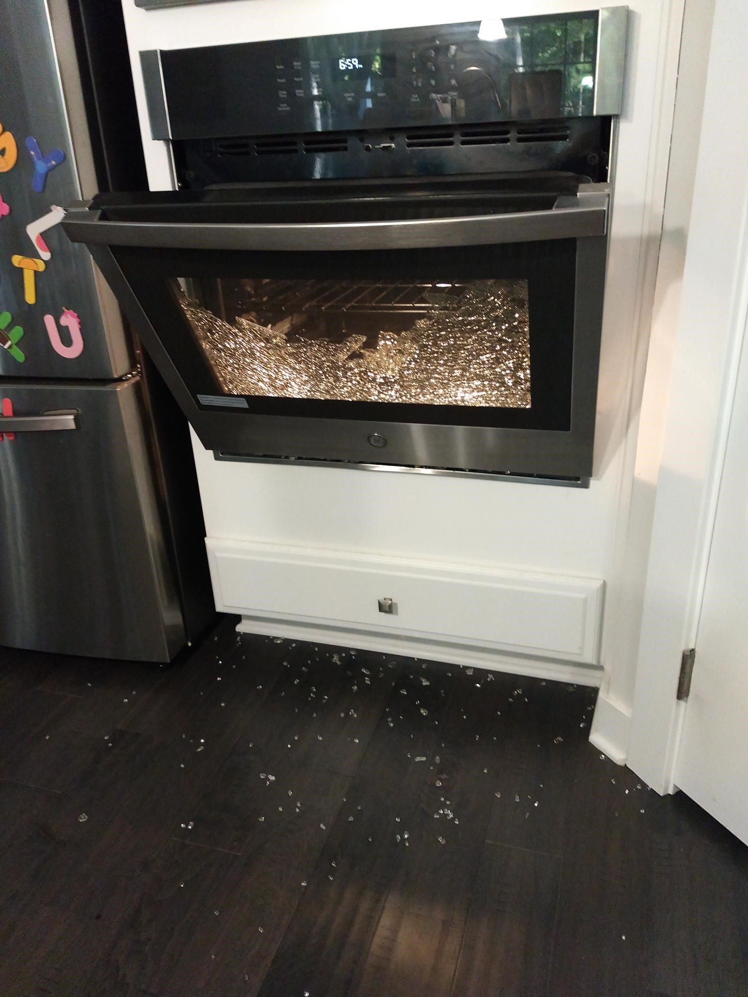 57 YOM consumer reports that the glass door to the electric oven shattered while preheating the unit. Upon kneeling to pick up the glass he sustained a small cut to the knee which he cared for at home. This product is unsafe. Laceration hazard.