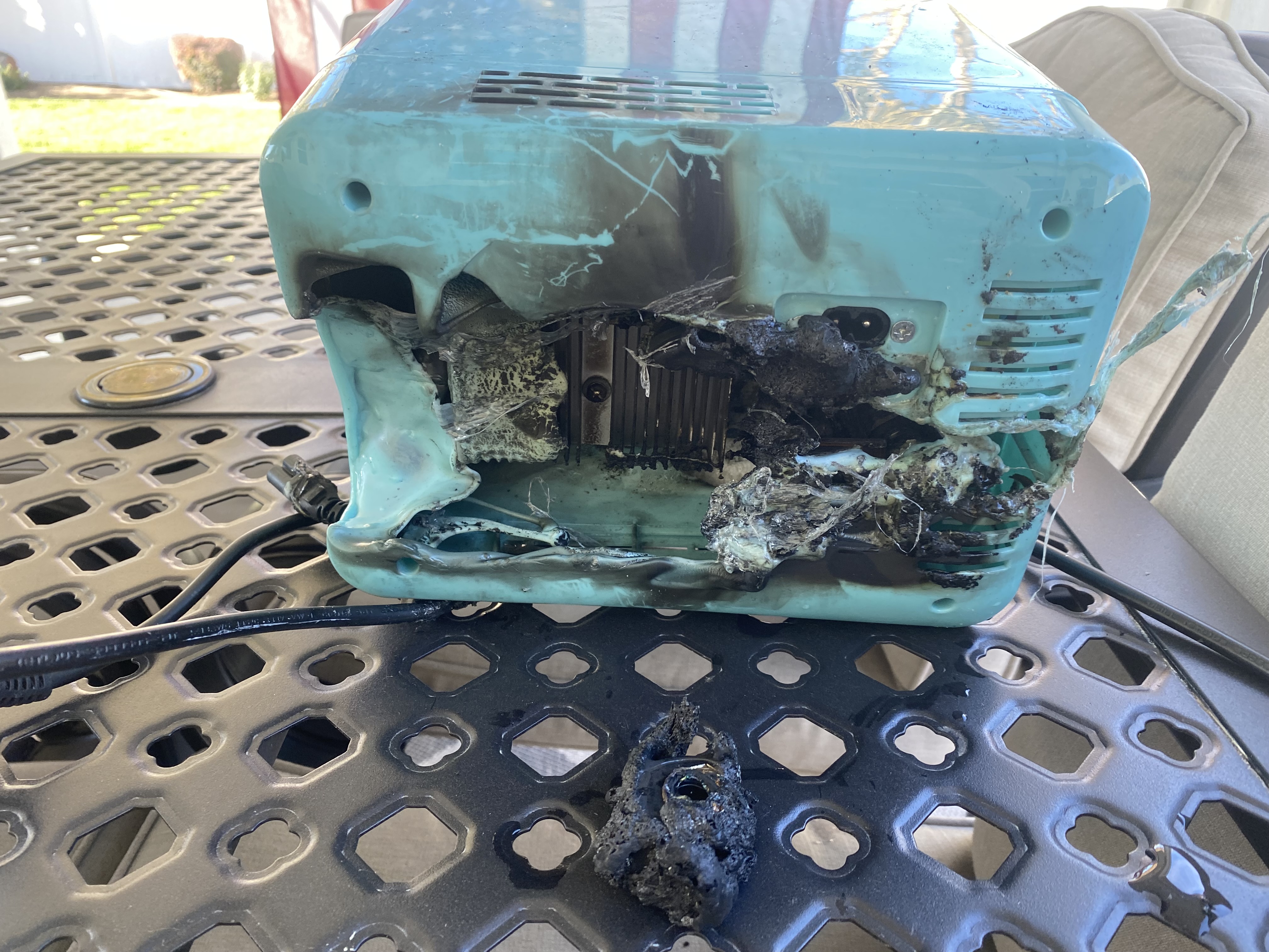 Consumer's mini refrigerator caught fire in 10 YOM son's room. When son awoke to alarm and smoke, refrigerator was a ball of fire. Unit was on shelf with nothing surrounding it. FD responded. No injuries.