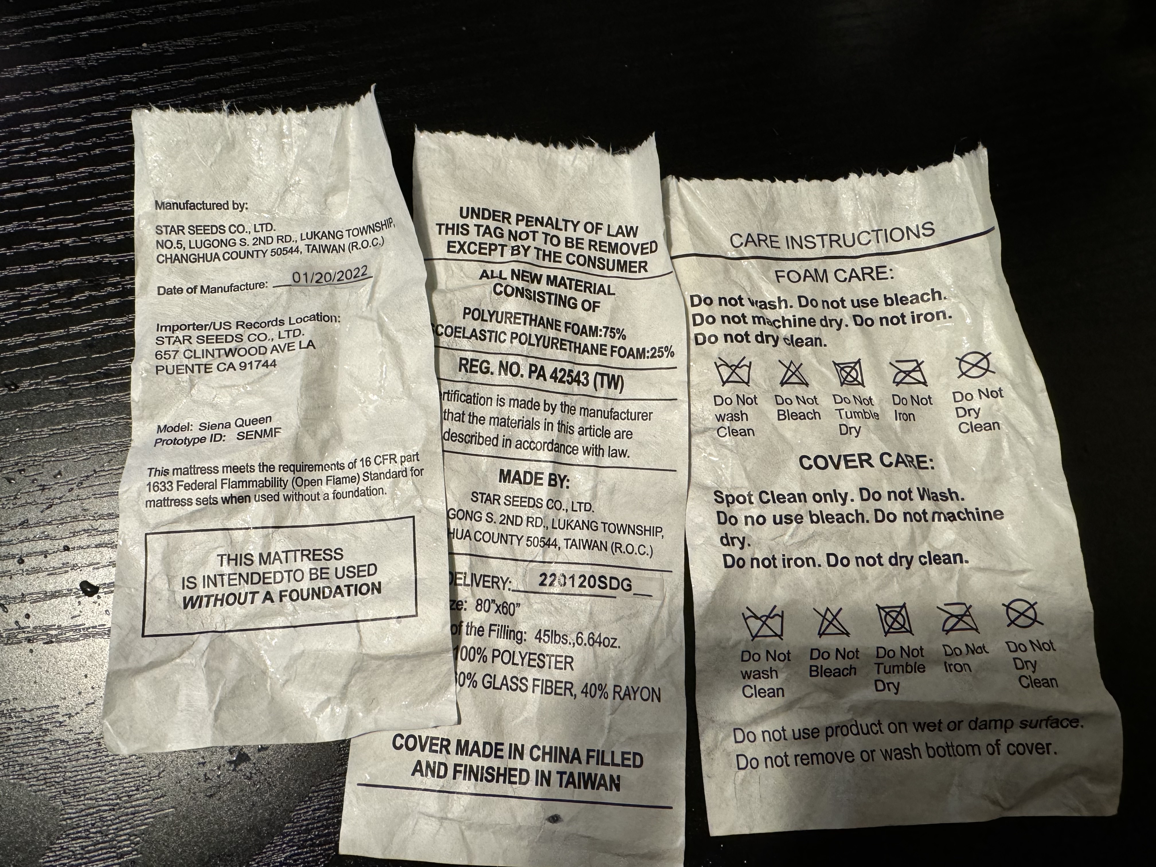 - Incident Description: I recently purchased a Queen-size Siena Mattress on Amazon.com. Siena is a sub-brand of Resident Home, which manufactures the Nectar mattress. Upon setting up the mattress, I noticed a warning that said, 'Do not remove the zippers. Property damage, etc., can occur if zippers are removed.' It was something along those lines. I knew this mattress contained fiberglass as a fire retardant and had researched numerous articles stating it is safe as long as I don't remove the outer cover. I never removed the cover. After purchasing it, I started having a stuffy nose, and my cat began sneezing occasionally. I attributed this to seasonal changes. Occasionally, my skin itched, which I also thought was due to seasonal allergies. However, the new kitten my housemate adopted likes to run around the house. She went under my bed, and I saw crystal-like sharp material protruding from the bottom barrier of my Siena mattress. I immediately recognized it as fiberglass, having seen enough news and videos about it on social media. I used my phone's flashlight to inspect further and realized that fiberglass was poking through the barrier, with some fibers attached to the metal bed slats, etc. I also found these sharp materials on the fitted sheet, although not as much as on the bottom of my mattress. I contacted Siena but haven't heard back for a few days. They kept asking for my contact information but to no avail. I feel really frustrated. I've ordered a new mattress and will remove this one myself, hoping that Siena resolves the issue and arranges for its disposal. I know fiberglass is safe if the outer cover is well-reinforced, but it seems that's not the case with Siena's product. It appears to be a thin layer of rayon or polyester. It's frustrating that they continue using this material without diligent research and development, especially after class-action lawsuits concerning their sub-brand Nectar.