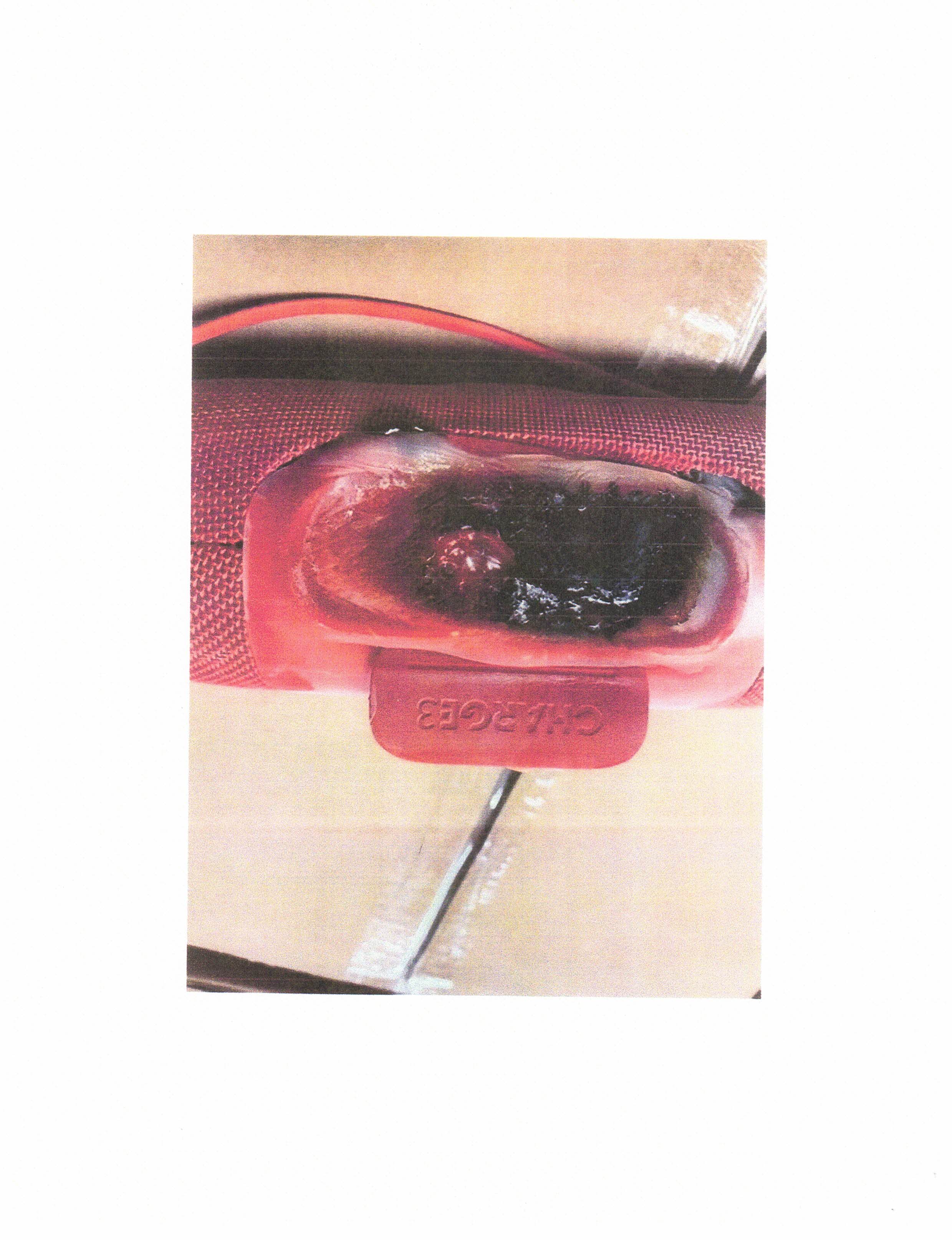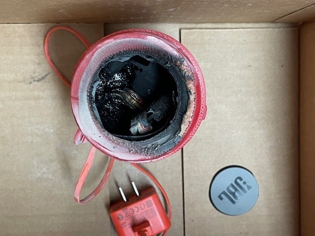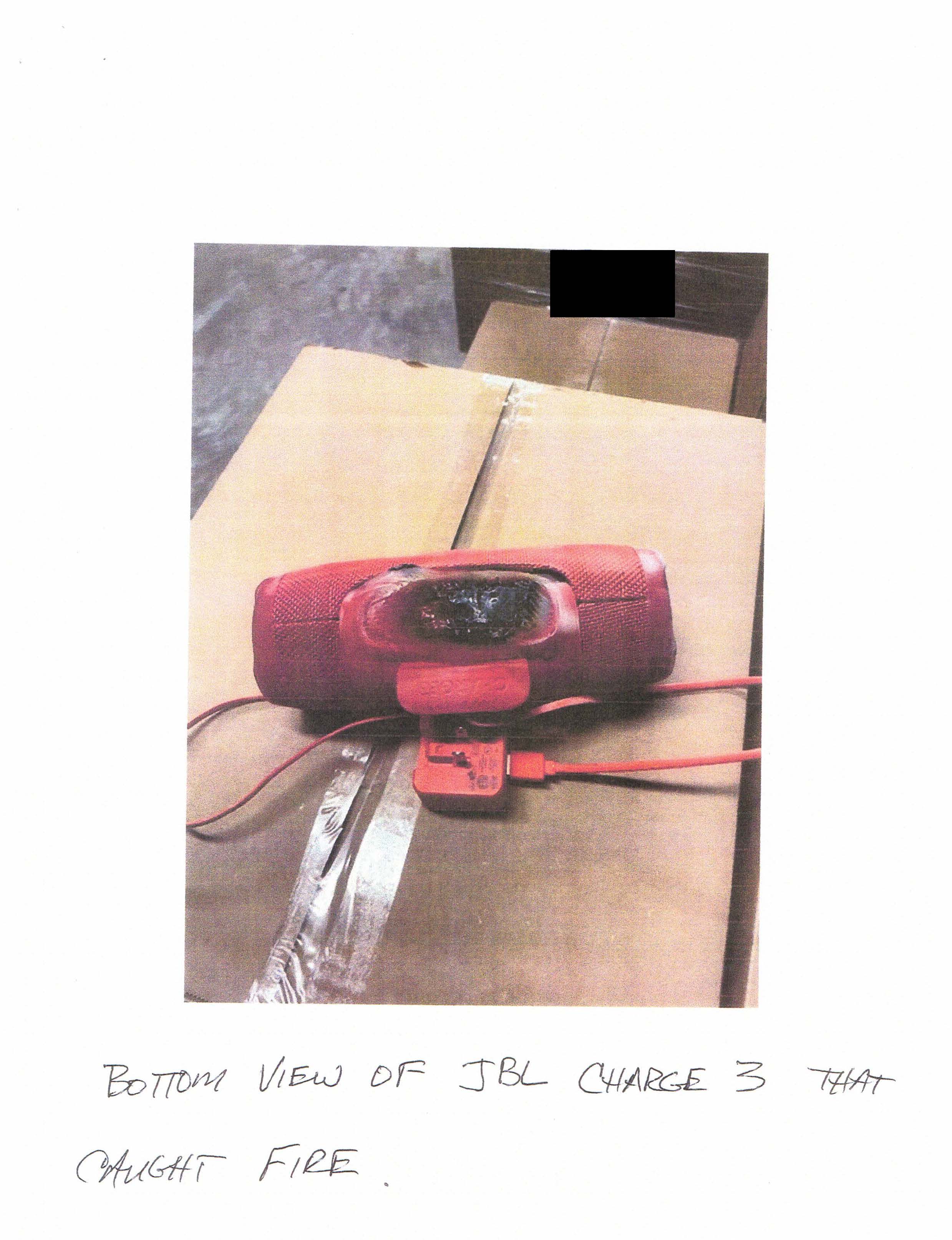 - Incident Description: My JBL Charge 3 bluetooth speaker exploded and caught fire. I had to put the fire out with a fire extinguisher to keep it from spreading. The explosion and fire caused damage to furniture and other items near the fire.